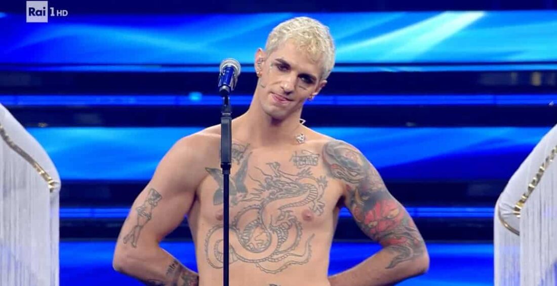 Il cantante ha deciso di presentarsi a torso nudo. Scelta che ha immediatamente acceso le polemiche.