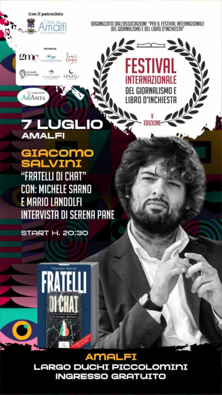 Lunedì 7 luglio 2025 alle ore 20.30, in Largo Duchi Piccolomini ad Amalfi, si terrà il settimo appuntamento della quinta edizione del “Festival Internazionale del Giornalismo e del Libro d’inchiesta”. Si parlerà di uno dei libri più venduti di questi mesi, Fratelli di Chat (ed. Paper First), che pubblica in esclusiva le chat interne di Fdi durante gli anni dell’ascesa al governo di Giorgia Meloni. L’autore Giacomo Salvini ne discuterà con l’ex Ministro delle Comunicazioni Mario Landolfi e l’avvocato Michele Sarno, presidente della Camera Penale di Salerno.