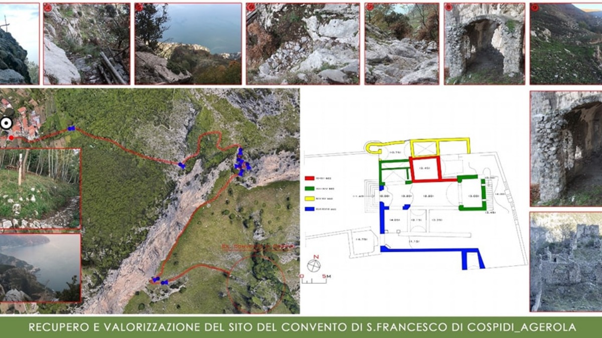 Accessibile da un circuito ad anello con partenza e ritorno a S. Lazzaro, i ruderi del Convento di Cospidi rappresentano un tesoro dal notevole pregio storico e architettonico, con una veduta a strapiombo sulla Costiera Amalfitana speciale, in sospensione fra il mare ed il cielo. Il luogo di esecuzione dell’opera è ubicato nel Comune di Agerola, in località Cospidi della frazione San Lazzaro.