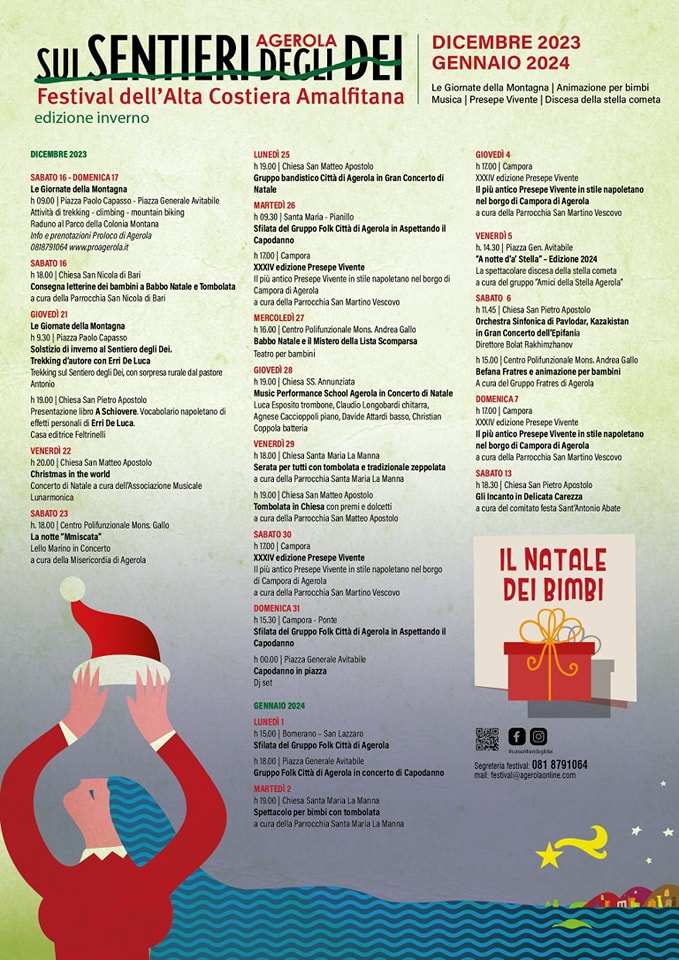 Tanti gli spettacoli musicali dedicati alla tradizione natalizia: tra questi, spiccheranno Christmas in the world a cura di Lunarmonica, due Concerti di Natale rispettivamente del Gruppo Bandistico Città di Agerola e della Music Perfomance School Agerola, il concerto dell’Epifania con l’Orchestra sinfonica di Pavlodar, Kazakistan, diretta dal maestro Bolat Rakhimzhanov. La chiusura del 13 Gennaio sarà affidata, invece, agli “Incanto in Delicata Carezza”.