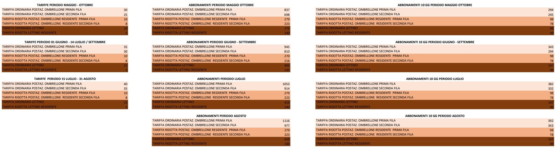 Si andrà così a spendere dai 40 euro per la postazione con ombrellone in prima fila – a pochi passi dalla battigia – ai 15 euro solo lettino nel periodo con maggior flusso turistico dal 15 luglio al 31 agosto.