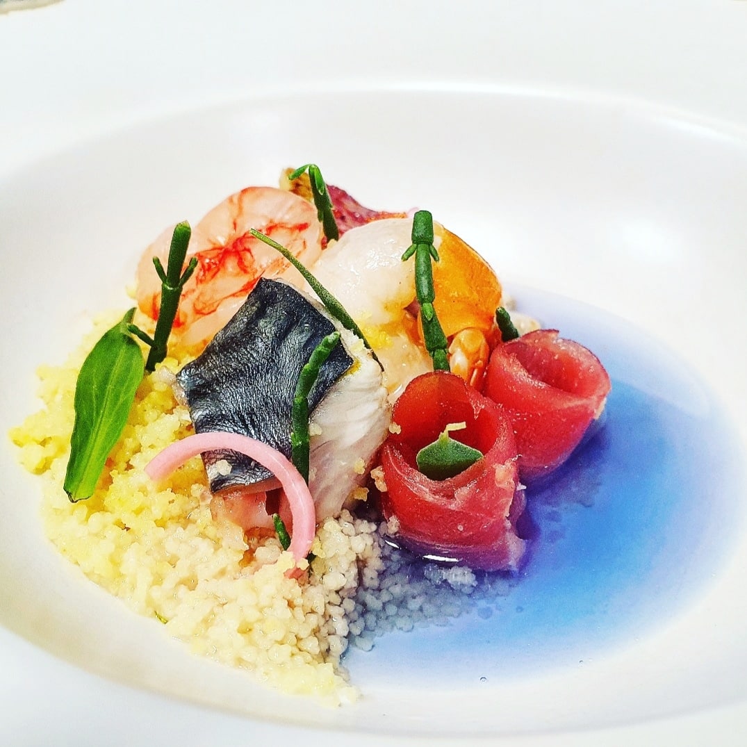 Il piatto presentato da Alessandro si chiama “In Riva Al Mare…” e rappresenta un ricordo visivo del mare della Costa d’Amalfi. Il cous cous richiama la sabbia, il mare è fatto con acqua di mare depurata e acqua di cozze, il colore è dato dall’infusione delle foglie del cavolo rosso. Sulla spiaggia troviamo varie tipologie di pesce con varie cotture e non. Iniziamo dal Maccarello(sgombro) che viene scottato violentemente in padella per due minuti senza rovinare la lucentezza della pelle, stesso procedimento per la triglia. Ancora cipolla in agrodolce e frutti di mare tipo cozze e vongole. Poi troviamo lo scampo che viene marinato 24 ore prima con agrumi ed erbette aromatiche, infine c’è il crudo, cioè gambero di Mazara del vallo e tonno rosso. Completano il piatto una varietà di erbe marine come la salicornia, l’obione e l’aster marittima.