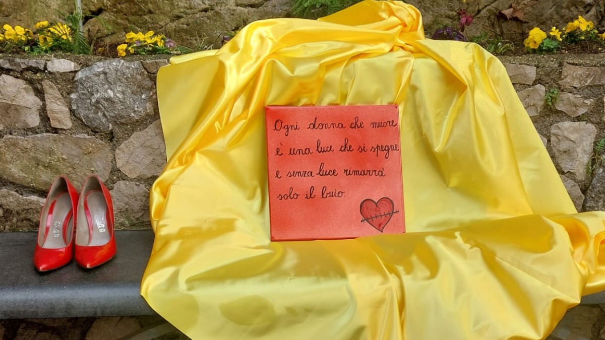 La frase vincitrice è stata incisa su una piastrella rossa donata dalla ceramica artistica La Tornietta della frazione Molina a Vietri sul Mare. L’opera è stata collocata sulla panchina in piazza Spirito Santo ad Amalfi. Adagiata su un drappo giallo, la piastrella rossa è stata adornata con delle scarpe rosse da donna e una pianta di mimosa portata all’inizio della manifestazione dagli alunni.