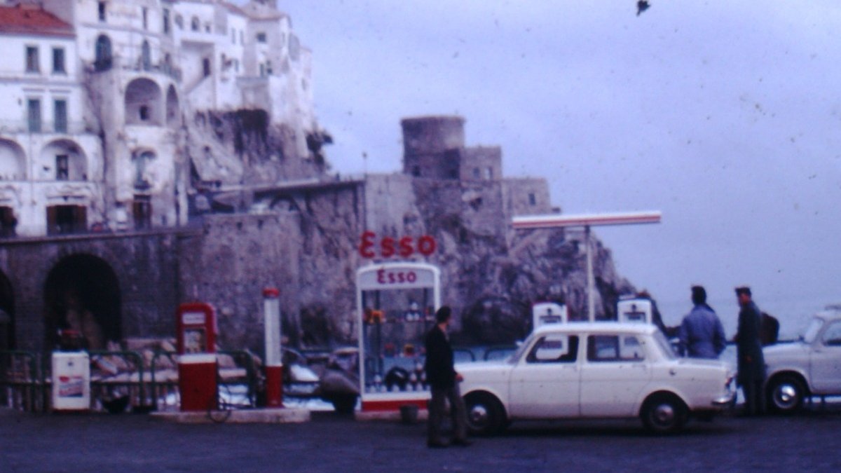 Gli altri scatti riguardano il vecchio distributore di benzina a ridosso del mare, all’altezza dell’attuale fermata degli autobus Sita Sud per Ravello e Scala, e due calessi, con cavalli e cocchieri, in attesa di portare qualche turista in giro, retaggio dell’era precedente all’impiego massiccio delle auto. Sullo sfondo, la segnaletica del posteggio taxi, segno della fase di passaggio in atto.