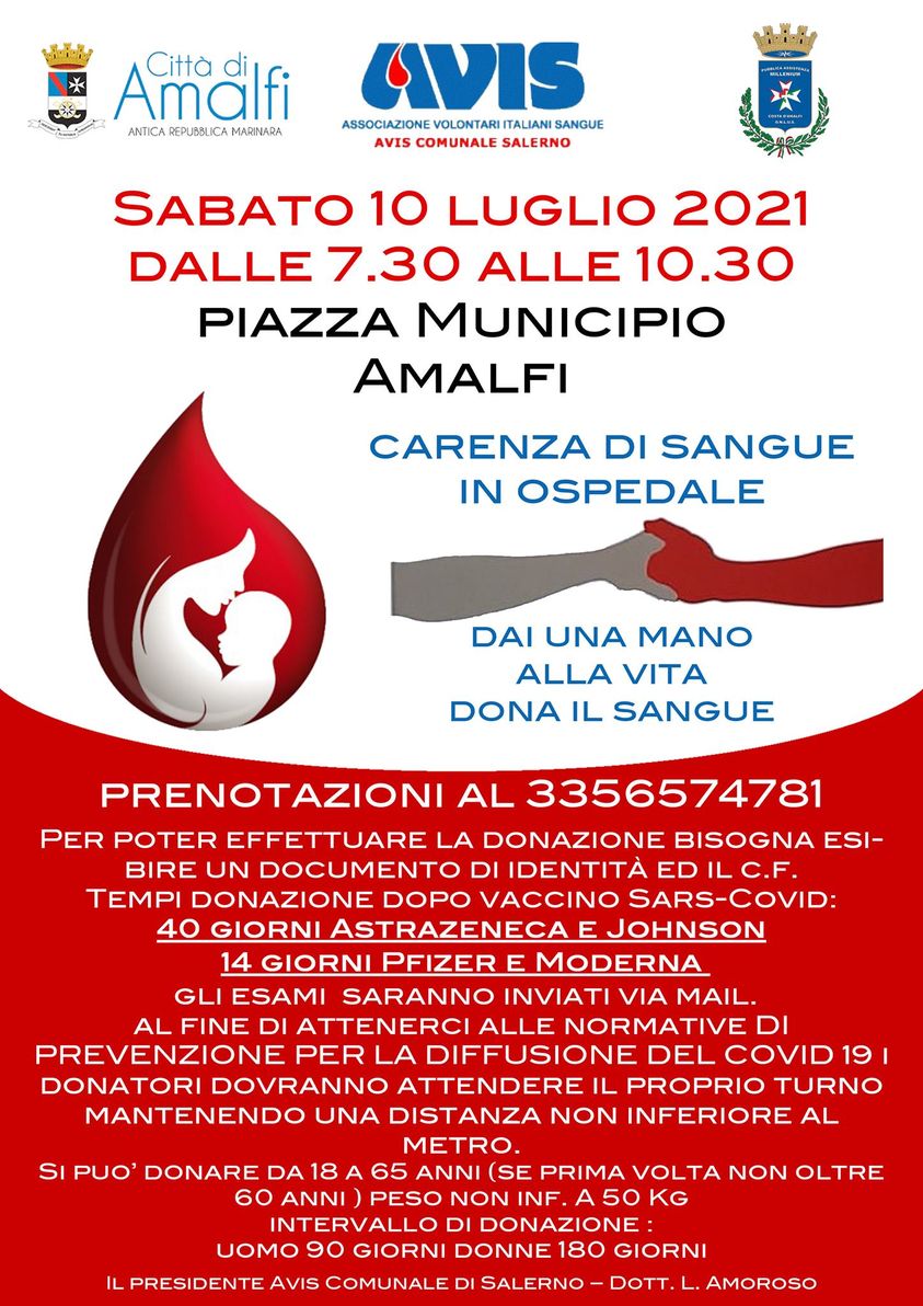 Si terrà sabato 10 luglio ad Amalfi una nuova donazione di sangue promossa dal Comune di Amalfi in collaborazione con l’Avis di Salerno.