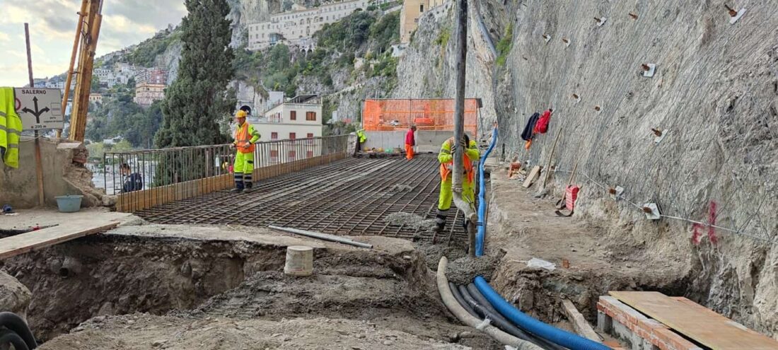 C’è stata ieri l’ultima gettata di calcestruzzo ad Amalfi. Gli operai hanno ormai raggiunto la quota strada e ben presto l’intervento di ricostruzione della strada statale 163 sarà ultimato.