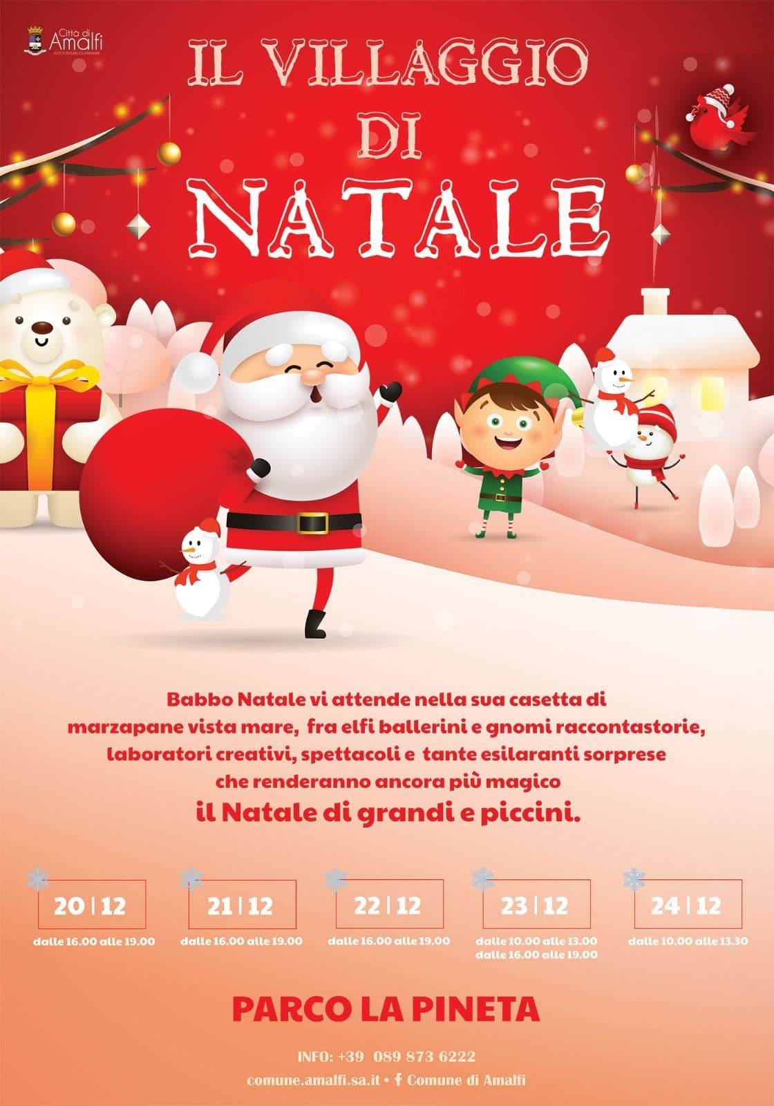 “Il Villaggio di Natale sarà aperto tutti i giorni, fino ad arrivare alla Vigilia del 24 dicembre con un meraviglioso spettacolo di prosa e musica pensato appositamente per i nostri bambini e le loro famiglie – prosegue l’assessore agli Eventi, Enza Cobalto – Sarà bello e divertente potersi muovere tra luci e decorazioni. La terrazza sul mare del porto di Amalfi sarà soprattutto location di tanti laboratori a tema che si alterneranno di giorno in giorno: i bimbi prepareranno il panettone e decoreranno i biscotti. E poi ci sarà il mago dello zucchero filato, le caldarroste e tanti show per ridere insieme e sognare con i personaggi delle fiabe. Infine, ad attenderli, il nostro meraviglioso Babbo Natale. Gli eventi, però, non si concluderanno con il Natale, ma proseguiranno fino all’Epifania. Sarà una vera festa della famiglia, perché siamo convinti che conquisterà adulti e piccolini”.