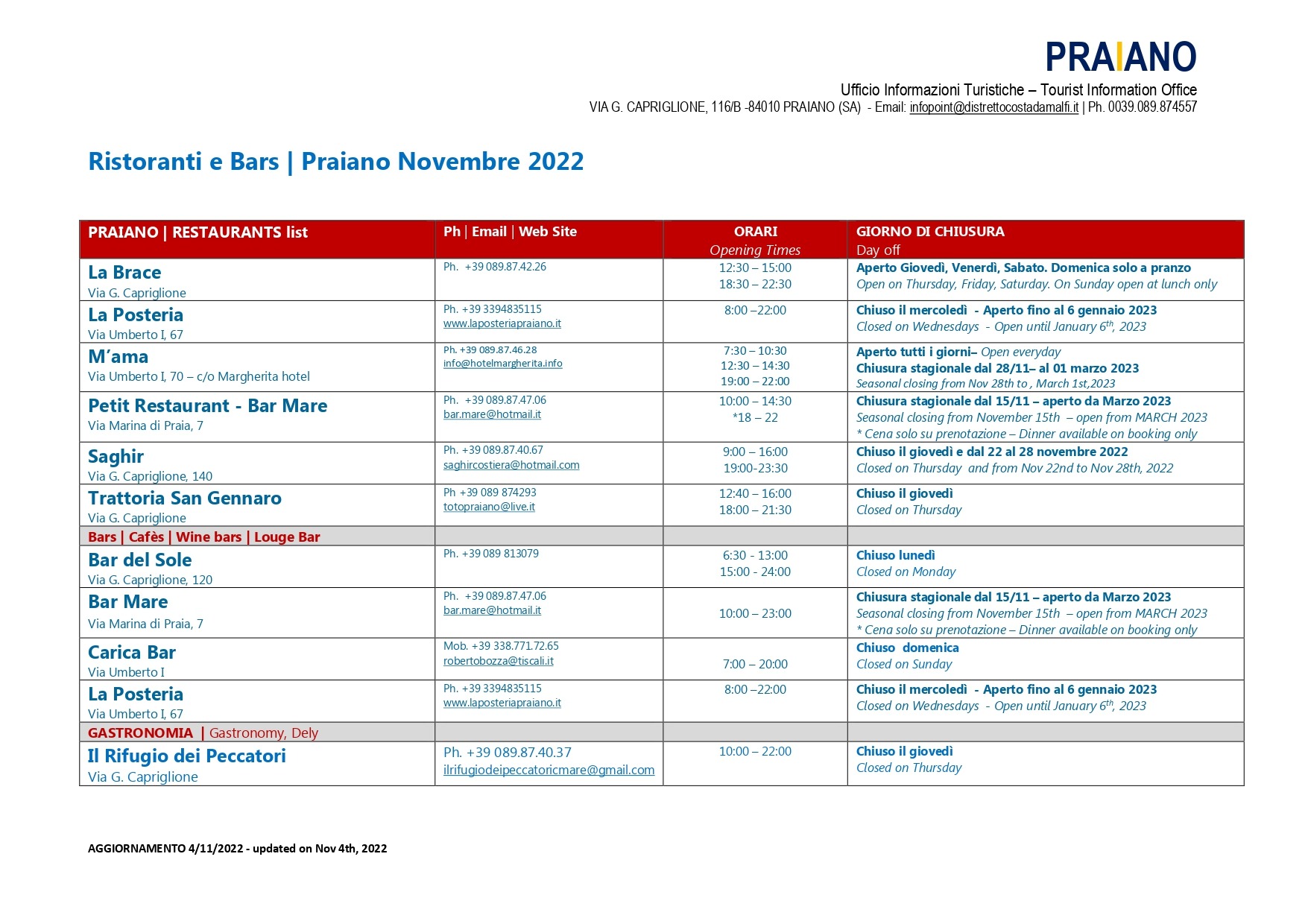 Nell’elenco vengono specificati i periodi di apertura di ogni singola attività durante la stagione invernale: il Comune si è fatto promotore di una sinergia tra gli esercizi attivi nel settore della ristorazione per garantire una presenza continua di bar e ristoranti aperti al pubblico.