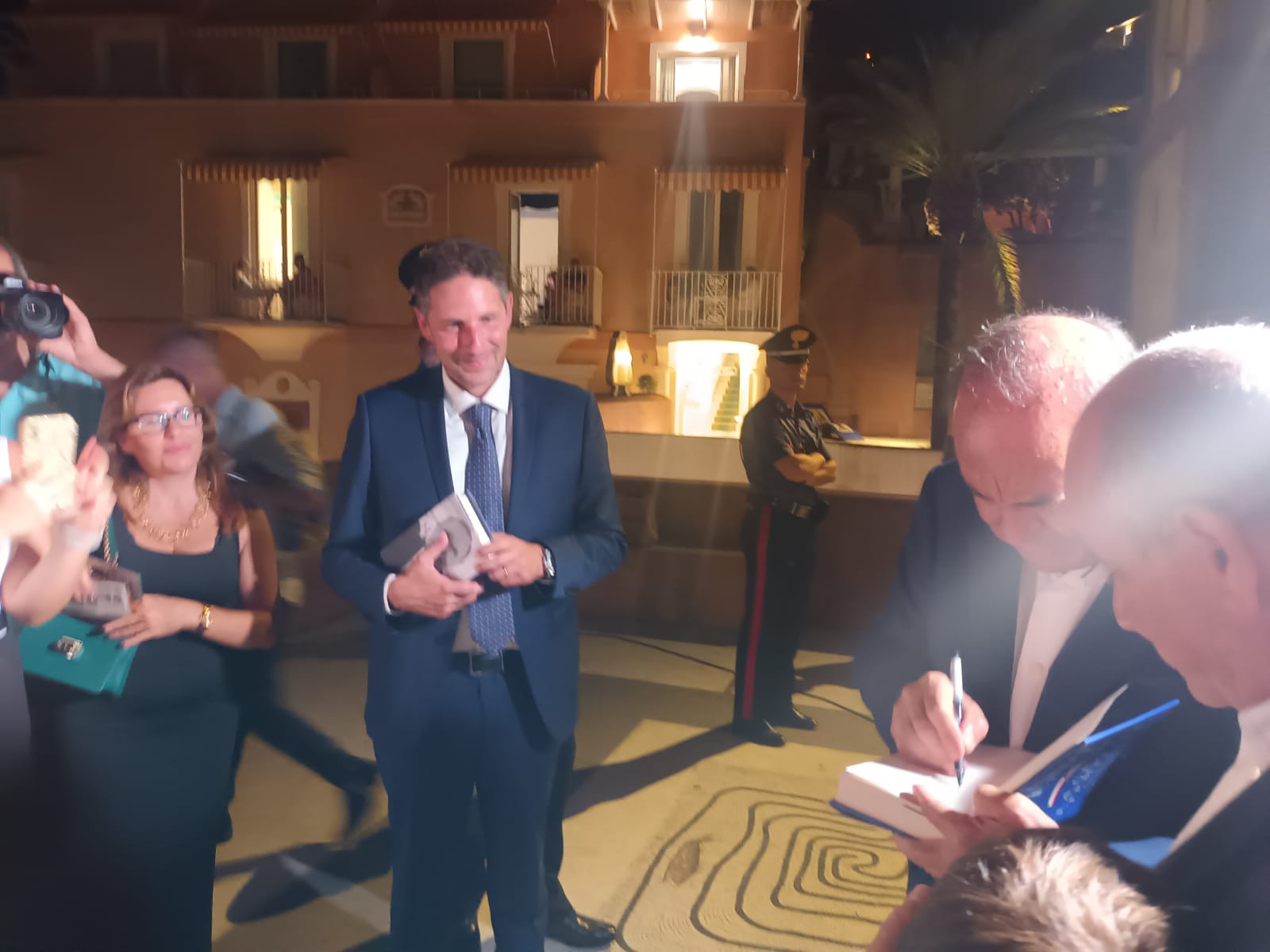 Dopo il consueto momento dedicato agli autografi sui libri dei tanti lettori presenti, non è mancato un momento di relax, per il giornalista, nel cortile di Palazzo Murat, nota struttura alberghiera sita nel pieno centro della città verticale.