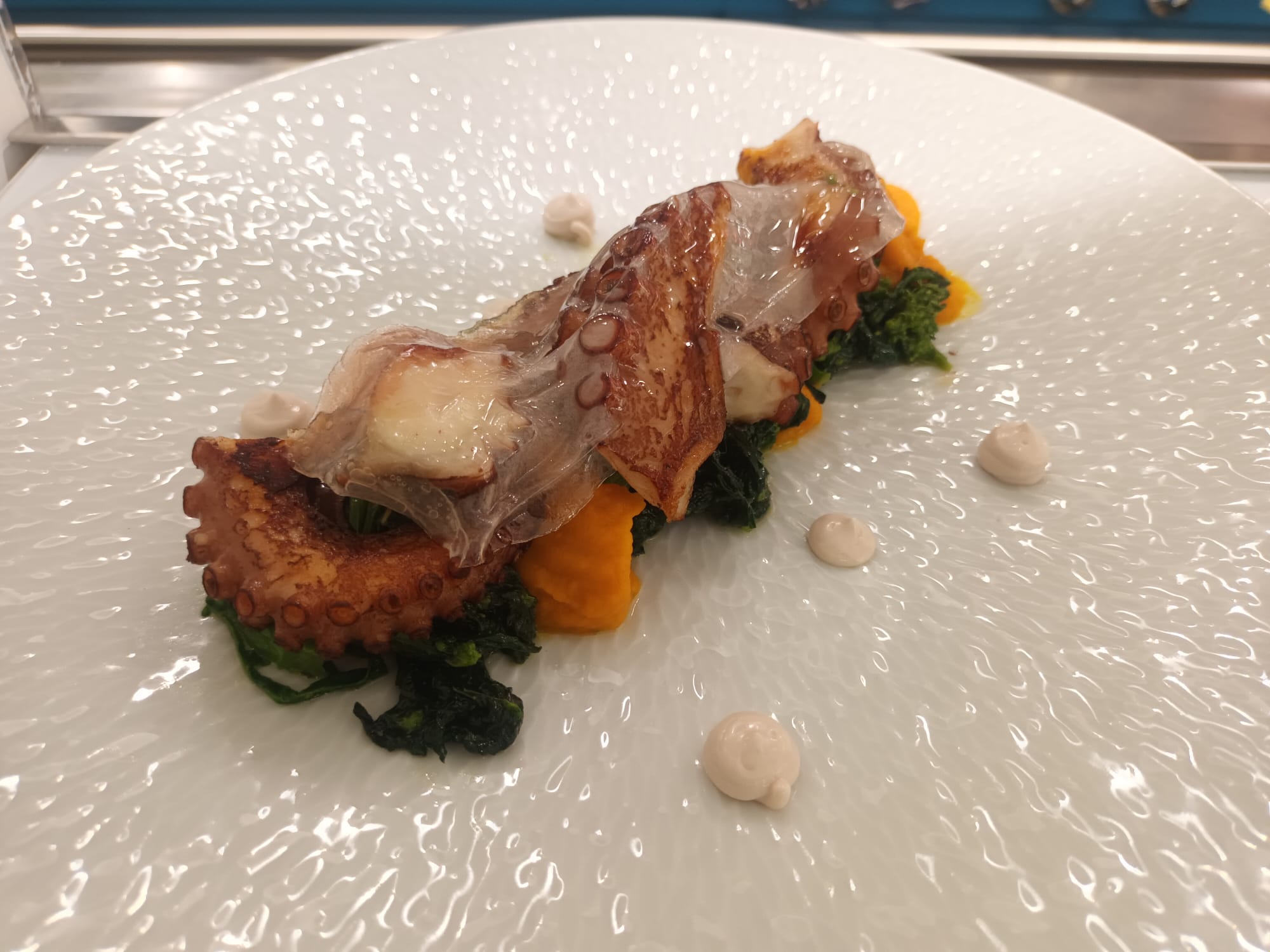 Tra i piatti signature di un autunno che ancora stenta a decollare ma ha già fatto mostra di sè nel paniere dei prodotti locali, ecco il polpo grigliato alla sua acqua con broccoli di rapa saltato al miele, aglio e peperoncino, zucca alla curcuma e lardo iberico.