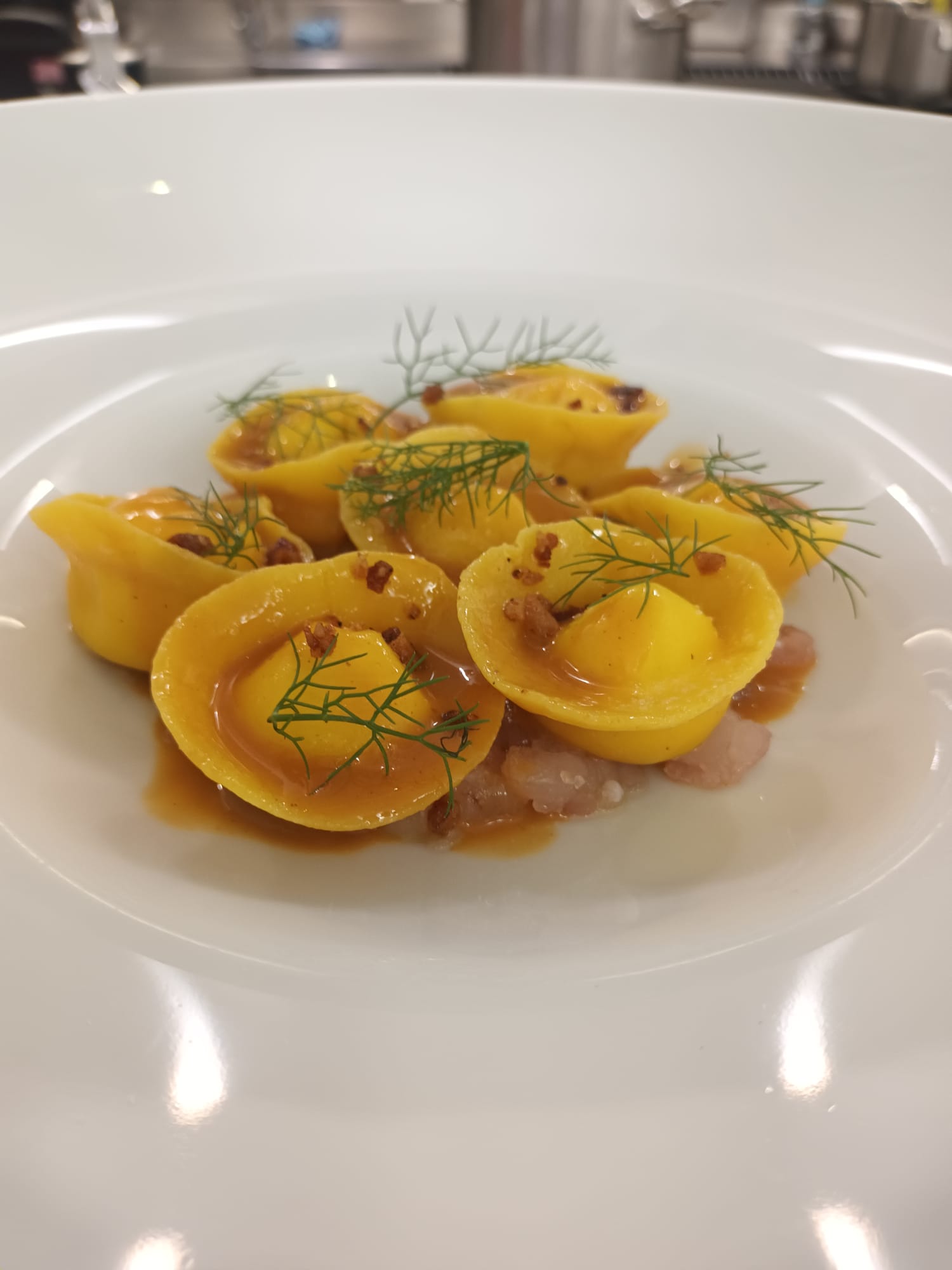 Il primo piatto autunnale per eccellenza, invece, è il tortello ripieno di caprino, tartare di cernia, il suo fondo, finocchietto, arancia e guanciale.
