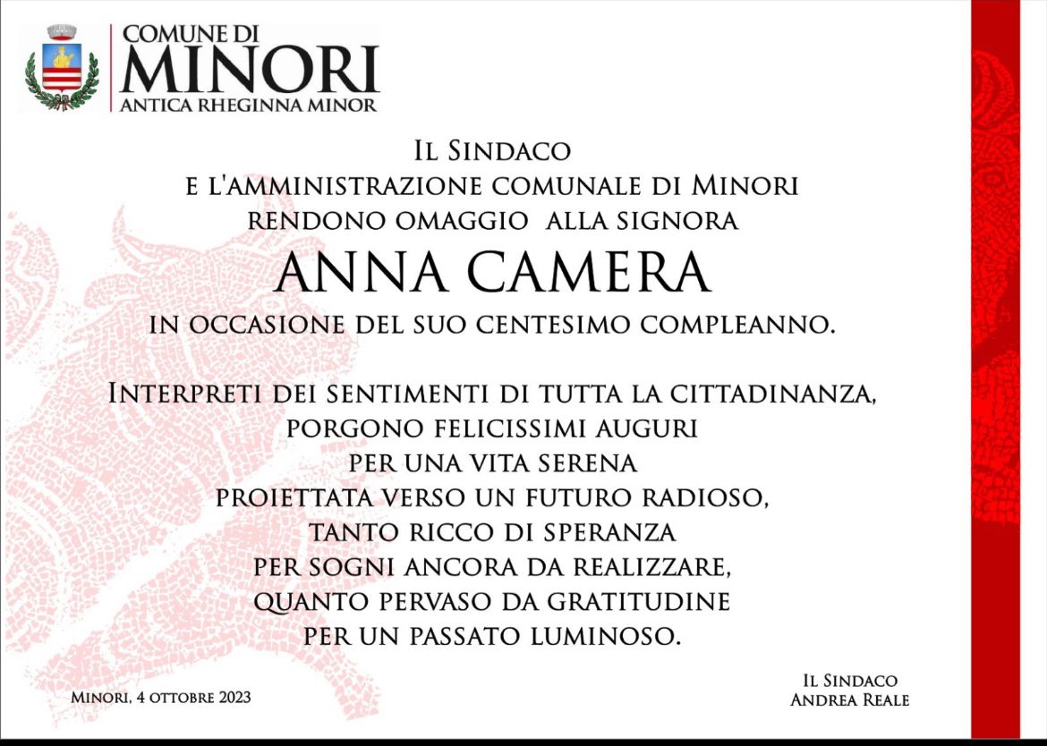 L’amministrazione comunale, in conclusione della cerimonia, ha omaggiato la signora Anna Camera con una pergamena a testimoniare l’affetto di tutta la comunità minorese.