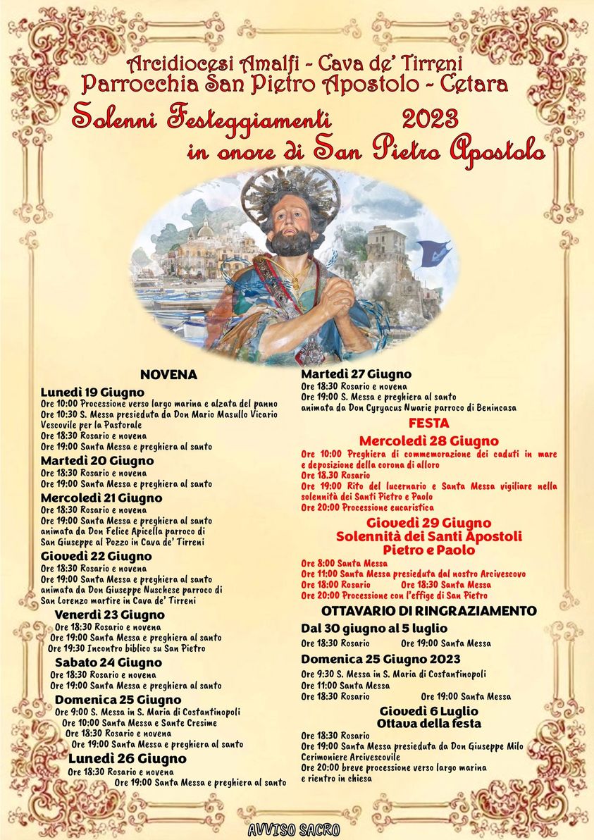 Sabato 29 giugno, Solennità dei Santi Pietro e Paolo, la prima Santa Messa sarà celebrata alle 8. La celebrazione delle 11, invece, sarà presieduta da Sua Eccellenza Monsignor Orazio Soricelli. Alle 18 il rosario, alle 18.30 la Santa Messa serale, per, poi, procedere, a partire dalle 20, con la processione del simulacro di San Pietro Apostolo per le vie di Cetara.