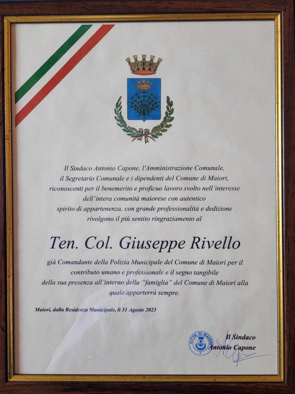 “Il sindaco Antonio Capone, l’Amministrazione Comunale, il Segretario Comunale e i dipendenti del Comune di Maiori, riconoscenti per il benemerito e proficuo lavoro svolto nell’interesse dell’intera comunità maiorese con autentico spirito di appartenenza, con grande professionalità e dedizione rivolgono il più sentito ringraziamento al Ten. Col. Giuseppe Rivello già Comandante della Polizia Municipale del Comune di Maiori per il contributo umano e professionale e il segno tangibile della sua presenza all’interno della “famiglia” del Comune di Maiori alla quale apparterrà sempre“: così recitava, infatti, la targa consegnata, come onorificenza, al già Comandante dei Vigili in occasione della cerimonia per il suo pensionamento.