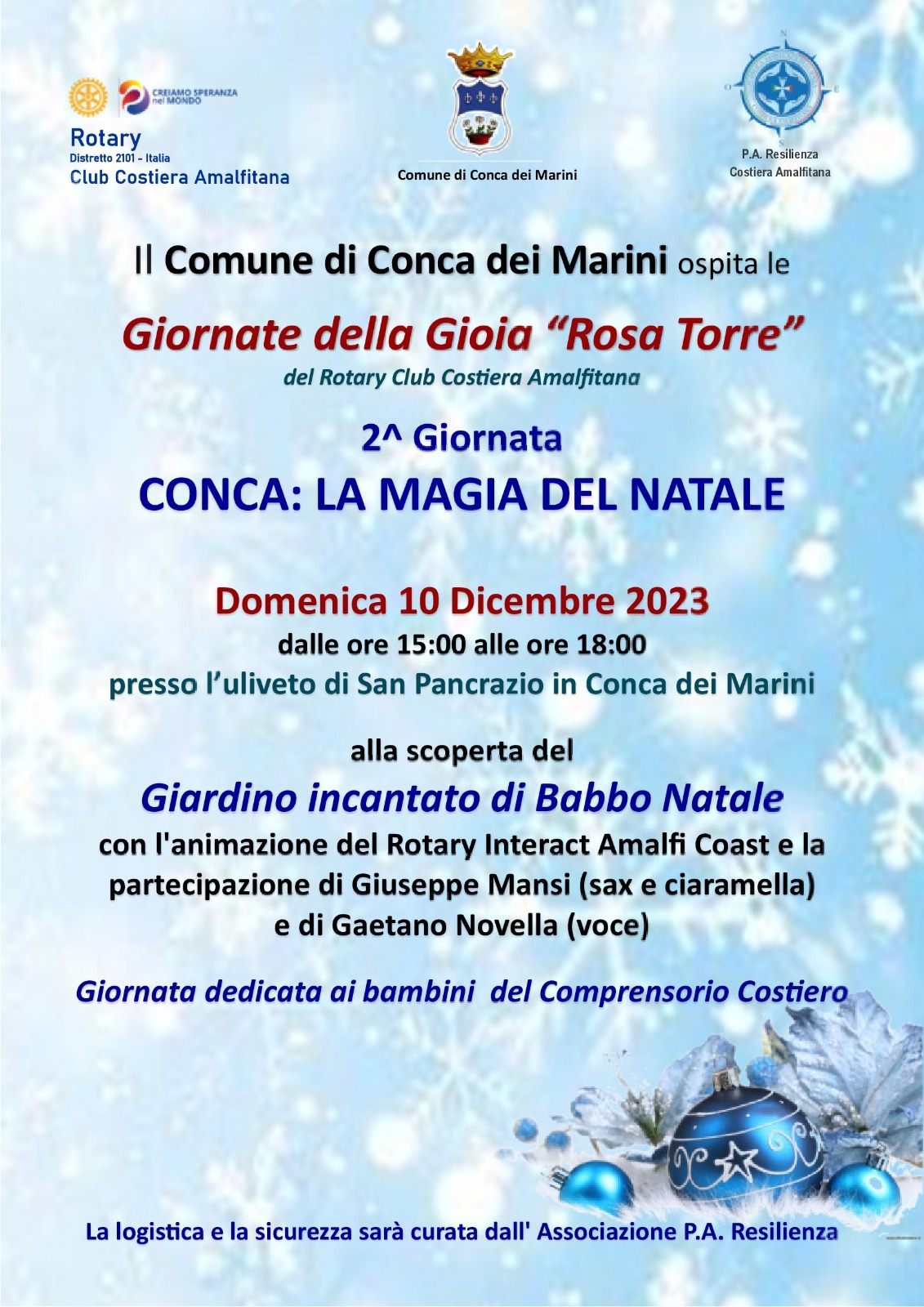 Appuntamento, dunque, per Domenica 10 Dicembre, dalle 15 alle 18, presso l’Uliveto di San Pancrazio a Conca dei Marini, alla scoperta del Giardino Incantato di Babbo Natale, con l’animazione del Rotary Interact Amalfi Coast e la partecipazione di Giuseppe Mansi (sax e ciaramella) e con la voce di Gaetano Novella.