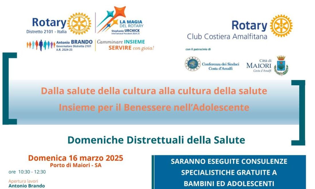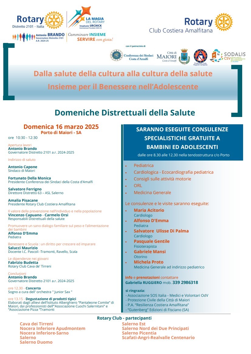 Domenica 16 Marzo 2025, dalle ore 8:30 alle ore 13:00, presso il porto turistico di Maiori si terrà la: la domenica distrettuale della salute dedicata all’adolescente ed al bambino nel corso della quale saranno erogate visite mediche specialistiche gratuite a bambini e adolescenti e tenute conferenze a tema.