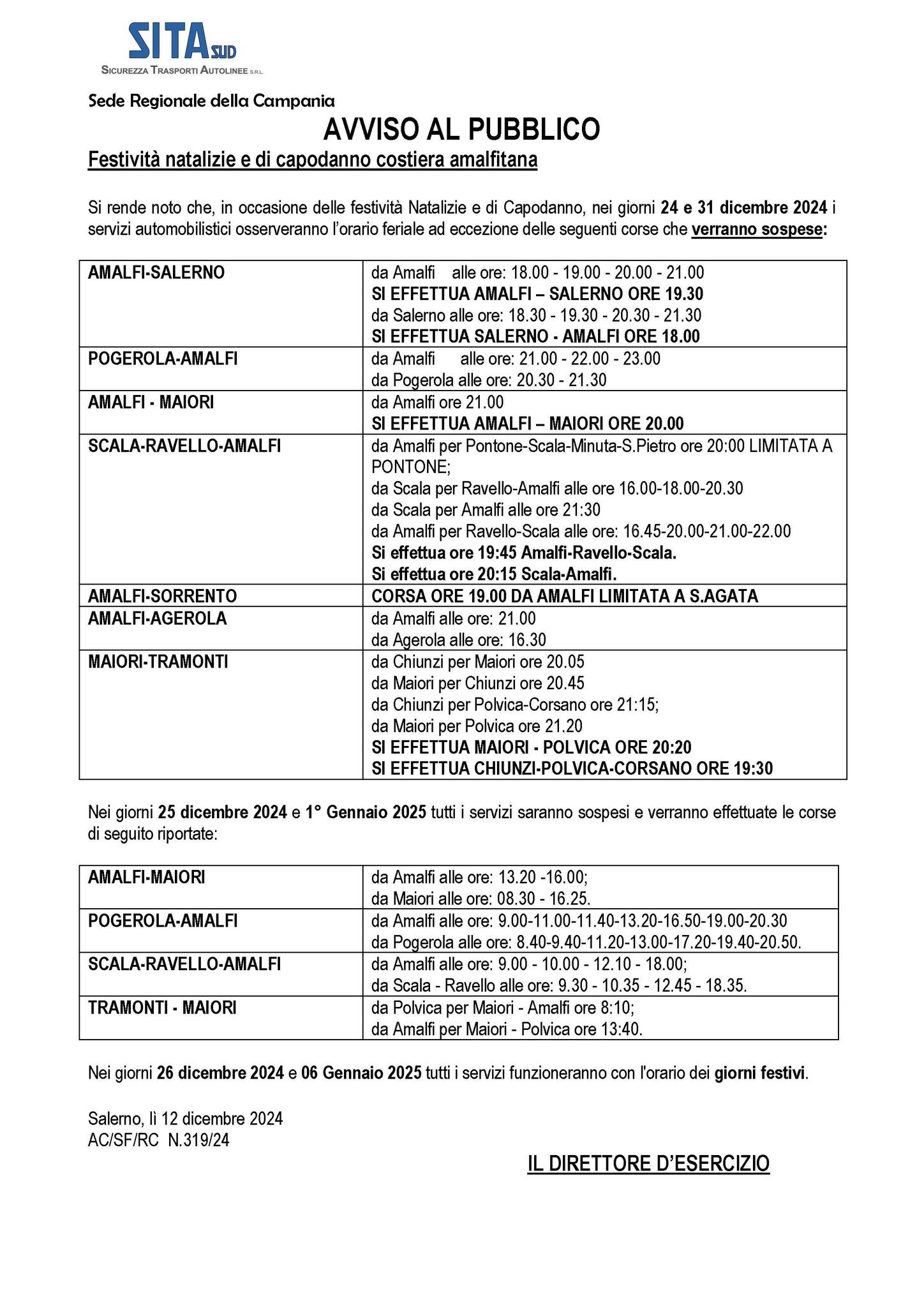 In occasione delle festività natalizie e di fine anno, SITA Sud ha annunciato alcune modifiche agli orari dei trasporti pubblici lungo la Costiera Amalfitana. Tra il 24 dicembre 2024 e il 6 gennaio 2025, diverse corse saranno sospese o subiranno variazioni per garantire un servizio adattato alle esigenze del periodo festivo.