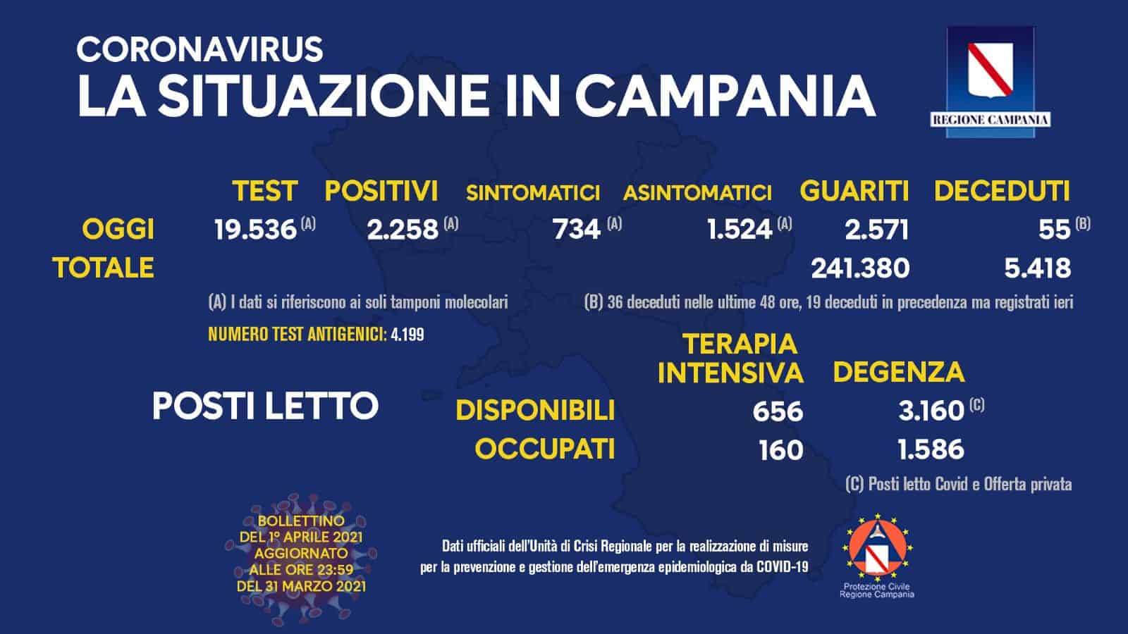 Nel bollettino odierno di contano 55 decessi mentre il totale delle vittime da inizio epidemia è di 5.418 persone. Infine oggi si contano 2.571 guariti e il totale dei guariti è di 241.380 persone.