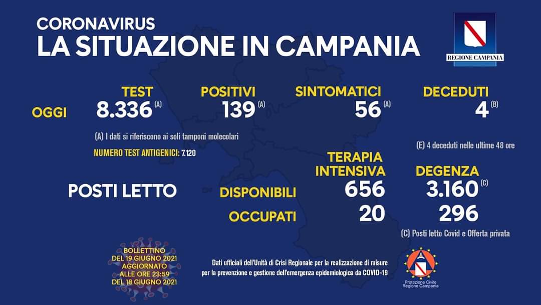 Oggi si contano 139 nuovi positivi di cui 56 sintomatici e sono stati processati del giorno: 8.336 tamponi molecolari e 7.120 tamponi antigenici.