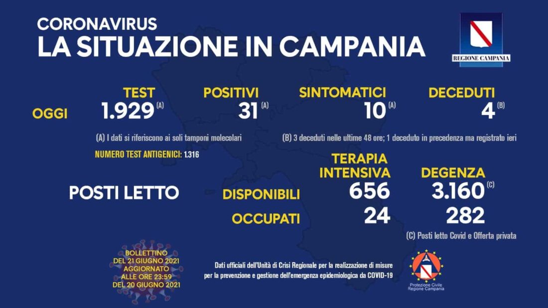 Oggi si contano 31 nuovi positivi di cui 10 sintomatici e sono stati processati del giorno: 1.929 tamponi molecolari e 1.316 tamponi antigenici.