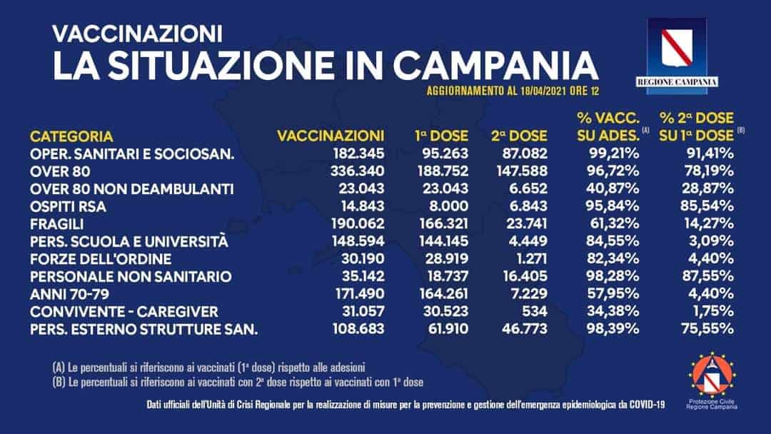 La Regione Campania comunica i dati delle vaccinazioni in Campania aggiornati alle ore 12 del 18 aprile 2021.