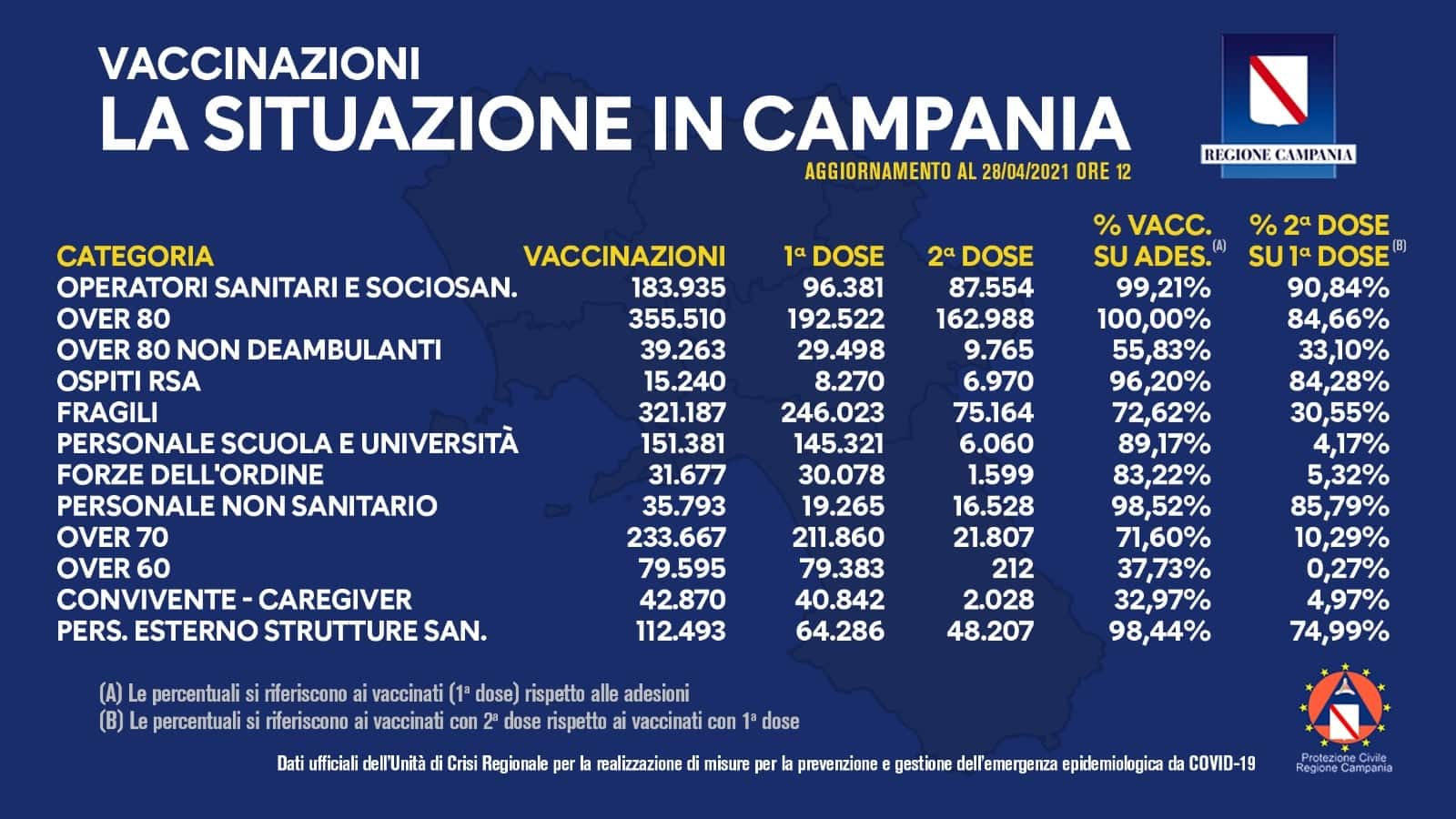 La Regione Campania comunica i dati delle vaccinazioni in Campania aggiornati alle ore 12 del 28 aprile 2021.