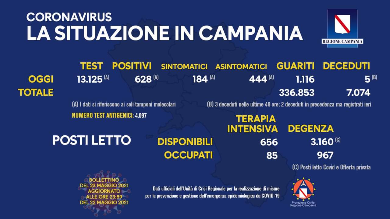 Oggi si contano 628 nuovi positivi di cui 444 asintomatici e 184 sintomatici e sono stati processati del giorno: 13.125 tamponi molecolari e 4.097 tamponi antigenici.