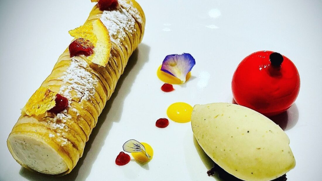 E così l’involucro della sfogliatella diviene un cilindro croccante, farcito con mousse di ricotta dolce alla semola, cannella, pasta homemade di arancia candita e vaniglia del Madagascar.