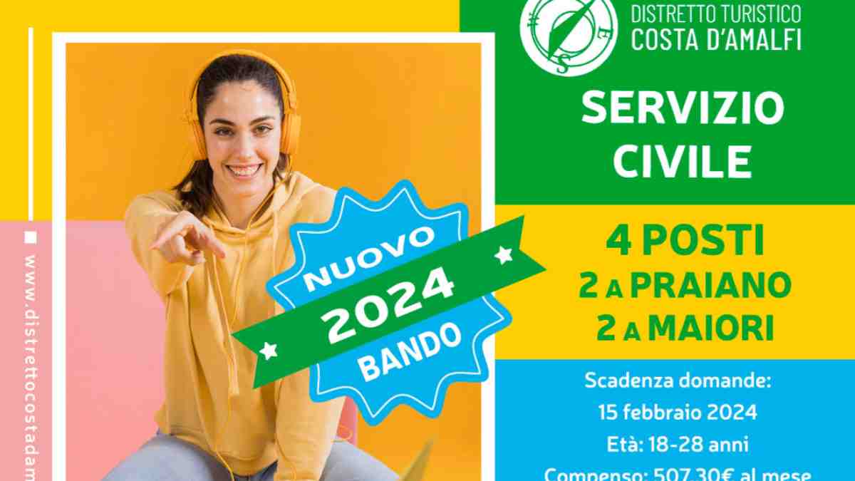 Quattro posti a bando per il Servizio Civile Universale al Distretto Turistico Costa d’Amalfi. Le domande possono essere presentate fino al 15 febbraio 2024 alle ore 14.00.