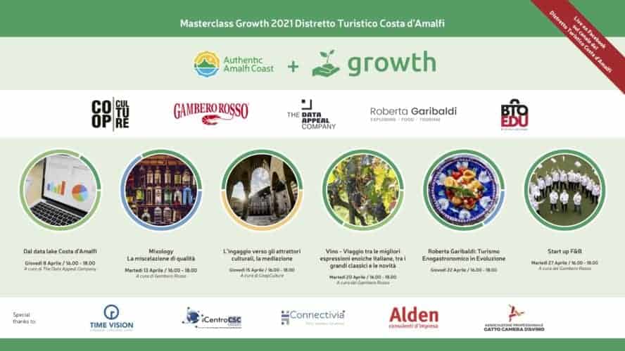 Riprendono i corsi online di formazione Growth organizzati dal Distretto Turistico Costa d’Amalfi con la Rete Sviluppo Turistico Costa D’Amalfi. Un calendario ricchissimo di spunti e riflessioni questo della primavera 2021.