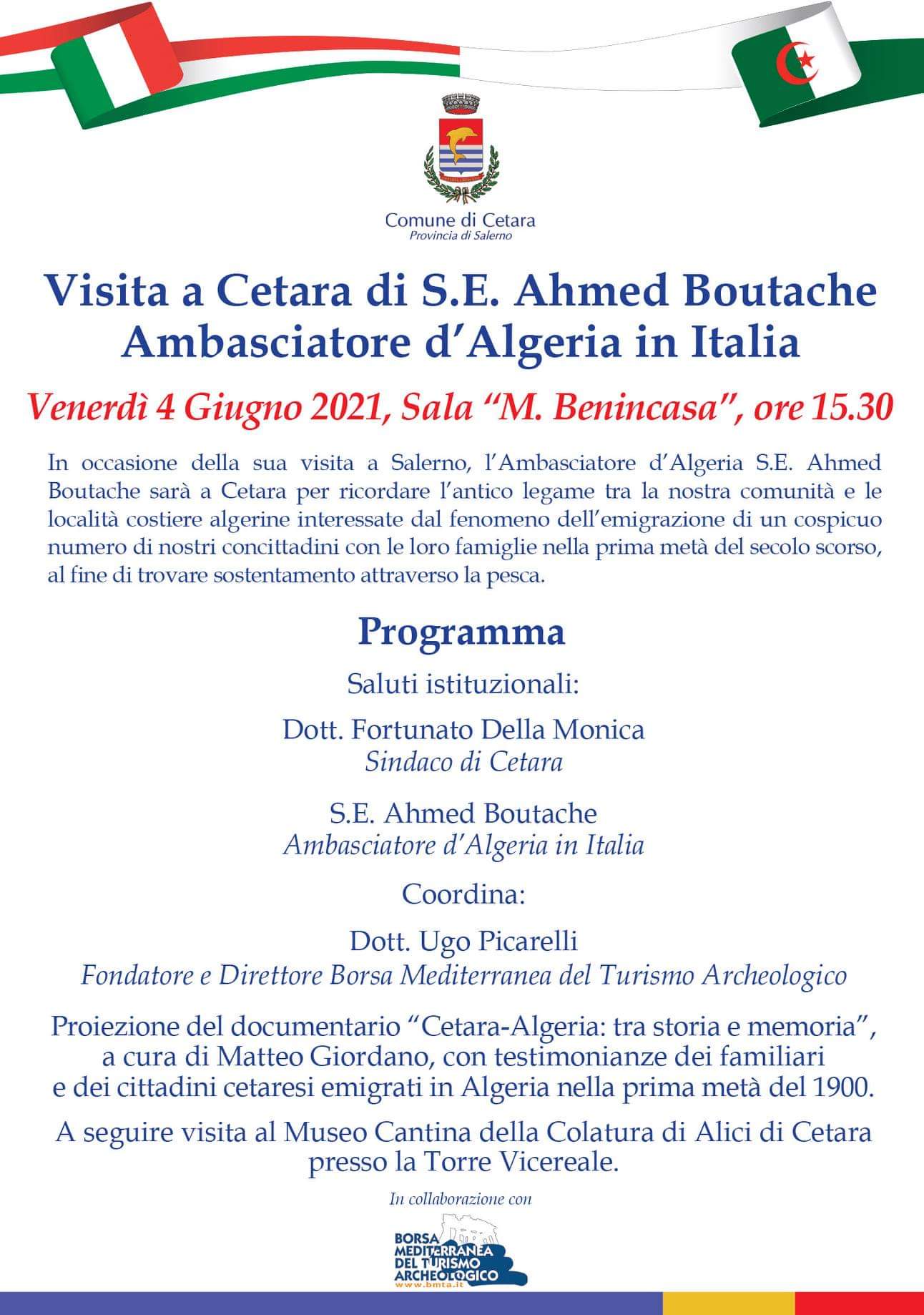 In occasione della sua visita a Salerno, i prossimi giovedì 3 e venerdì 4 giugno, l’Ambasciatore d’Algeria in Italia, S.E. Ahmed Boutache sarà a Cetara per ricordare l’antico legame tra il borgo e le località costiere algerine interessate dal fenomeno dell’emigrazione di un cospicuo numero di concittadini con le loro famiglie, durante la prima metà del secolo scorso, al fine di trovare sostentamento attraverso la pesca.