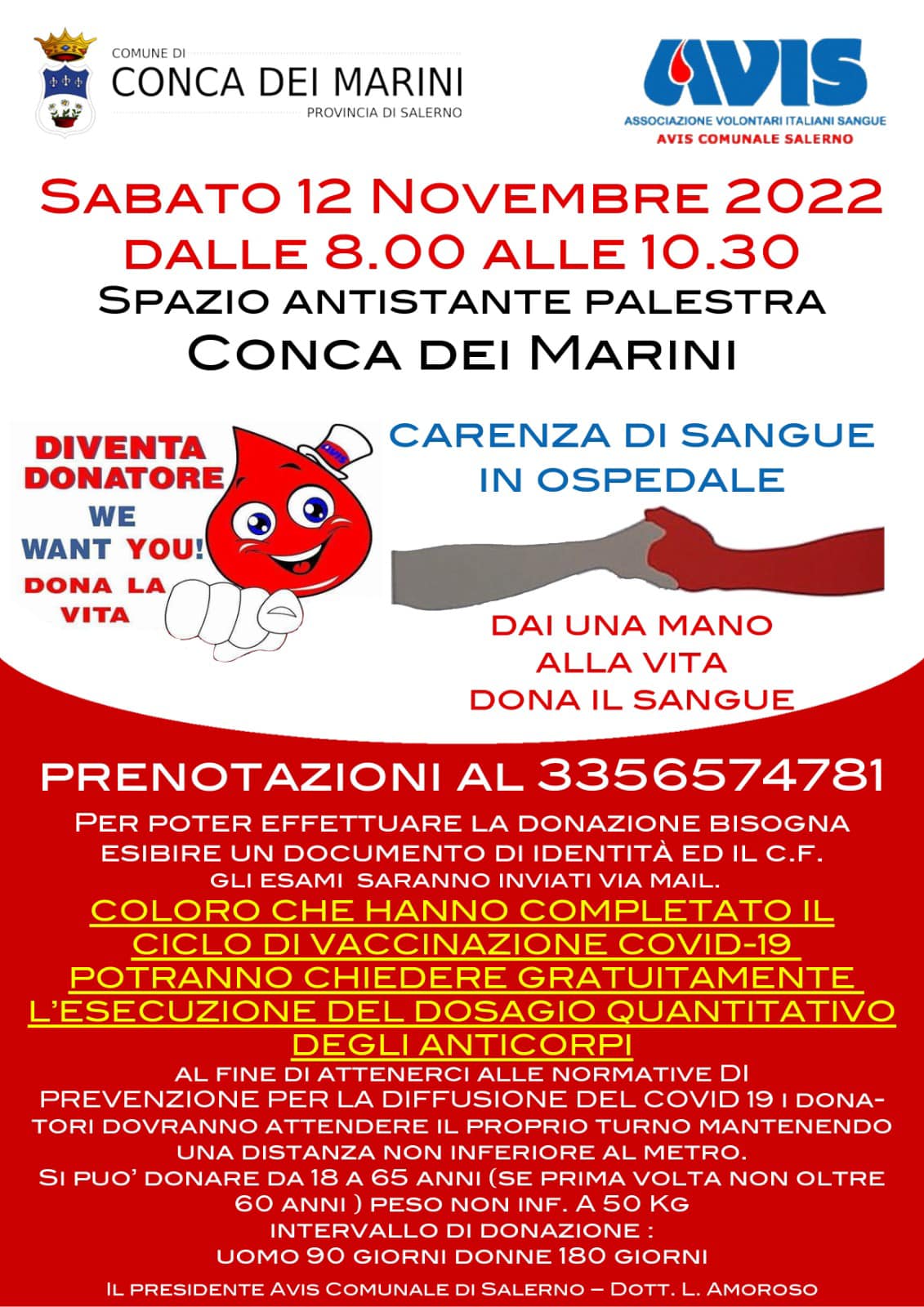 Una mattinata dedicata alle donazioni di sangue quella prevista in programma a Conca dei Marini per Sabato 12 Novembre.