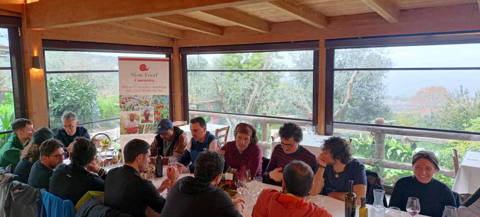 In seguito, la camminata verso il Monte Vico Alvano, la sosta per la degustazione di una tradizionalissima merenda, a base di pane, olio, timo e rosmarino, preparato al momento; prima di giungere all’Agriturismo “Antico Casale” guidato dai fratelli Persico, vero e proprio scrigno dell’identità gastronomica del territorio, uno dei pochi a produrre l’amarena appassita dei Colli di San Pietro.