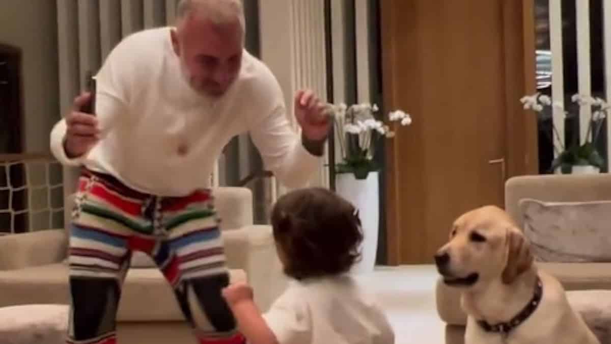 I due sono in casa e ballano gioiosi. Con loro c’è anche un cagnolone. Si tratta di una scena di vita familiare ritratta nella sua spontaneità. Blu è veramente molto carina e sgambetta a ritmo di musica. Il suo papà la segue e si mostra divertito. Gianluca Vacchi dedica questo momento a quella che definisce la sua piccola principessa.