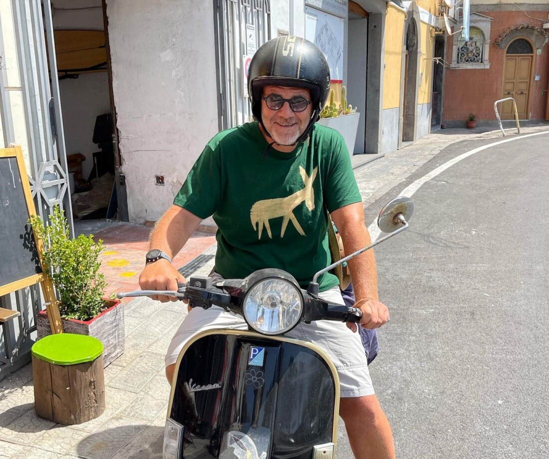 Giulio Golia prosegue la sua vacanza in Costiera Amalfitana. La “Iena” si sta godendo le bellezze della Divina a bordo di una Vespa.