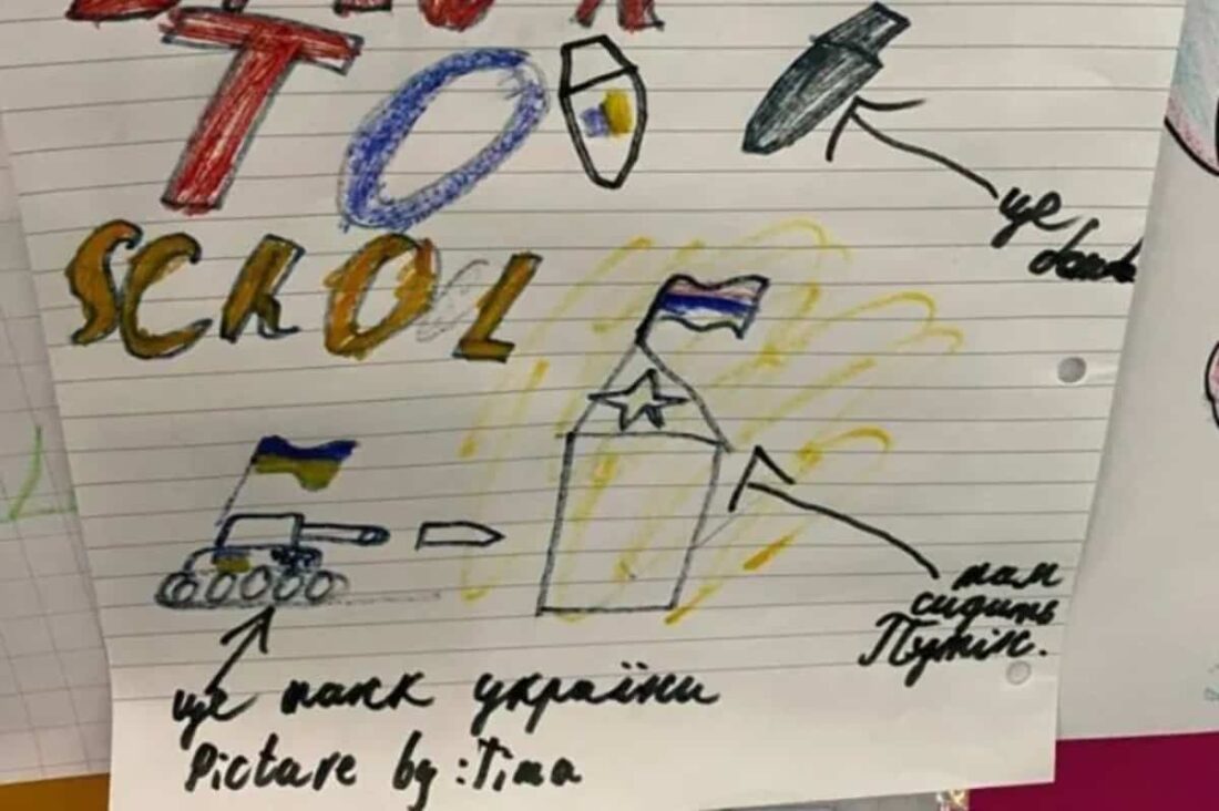 L’esperienza della guerra è riassunta tutta qui, in un bambino scioccato ed arrabbiato per la distruzione della sua scuola. Come si vede nel disegno, infatti, i carrarmati distruggono e bombardano gli edifici ed in particolare la sua scuola elementare. In alto la scritta in inglese “Back to school”.
