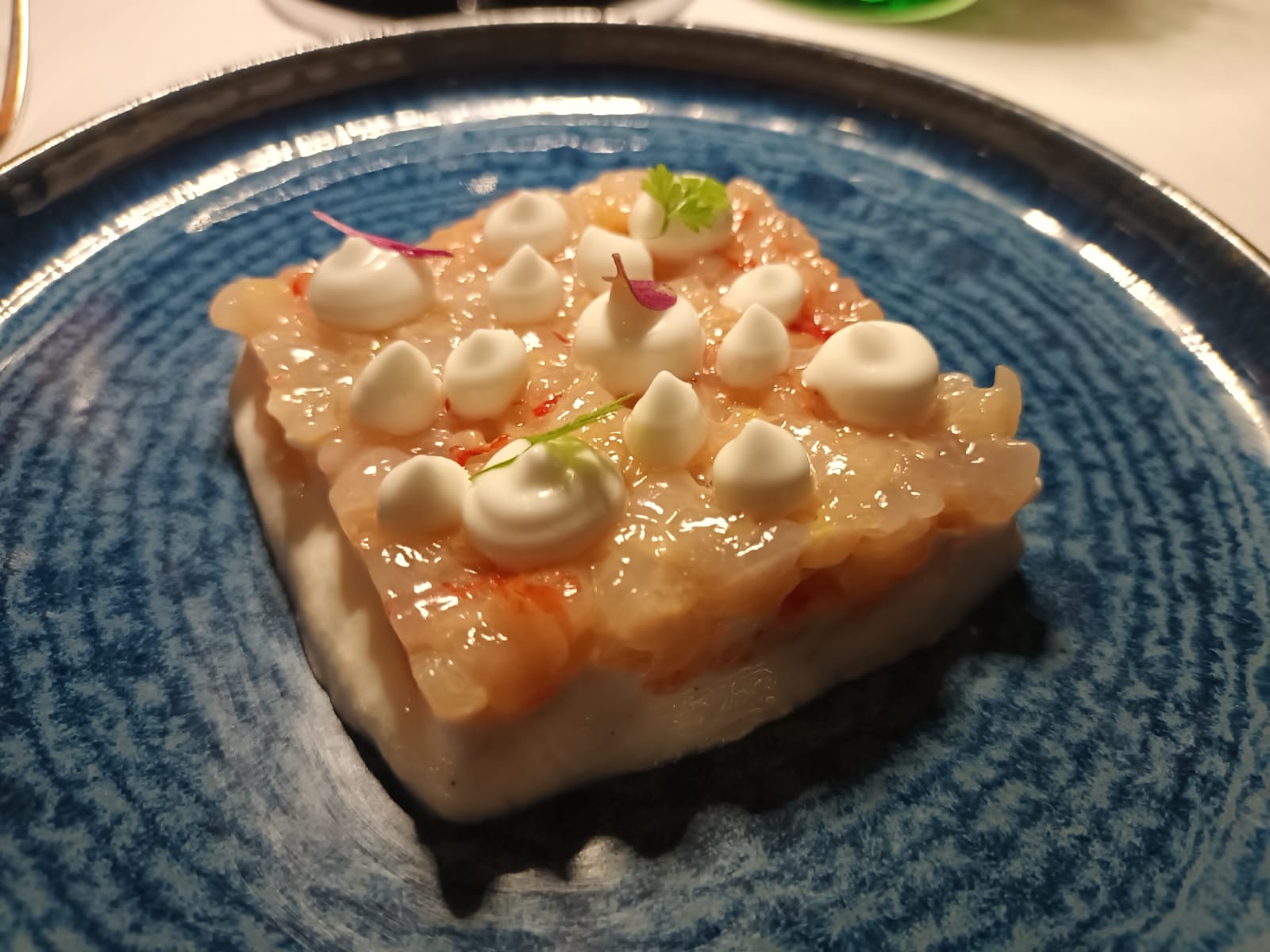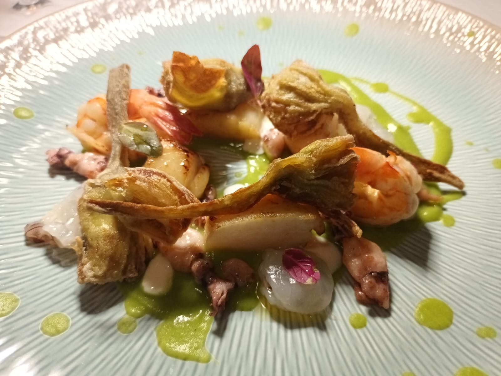 Grande è l’impronta stagionale della proposta: lo si nota, ad esempio, dalle capesante e mazzancolle cotte e crude, ricotta salata e carciofi.