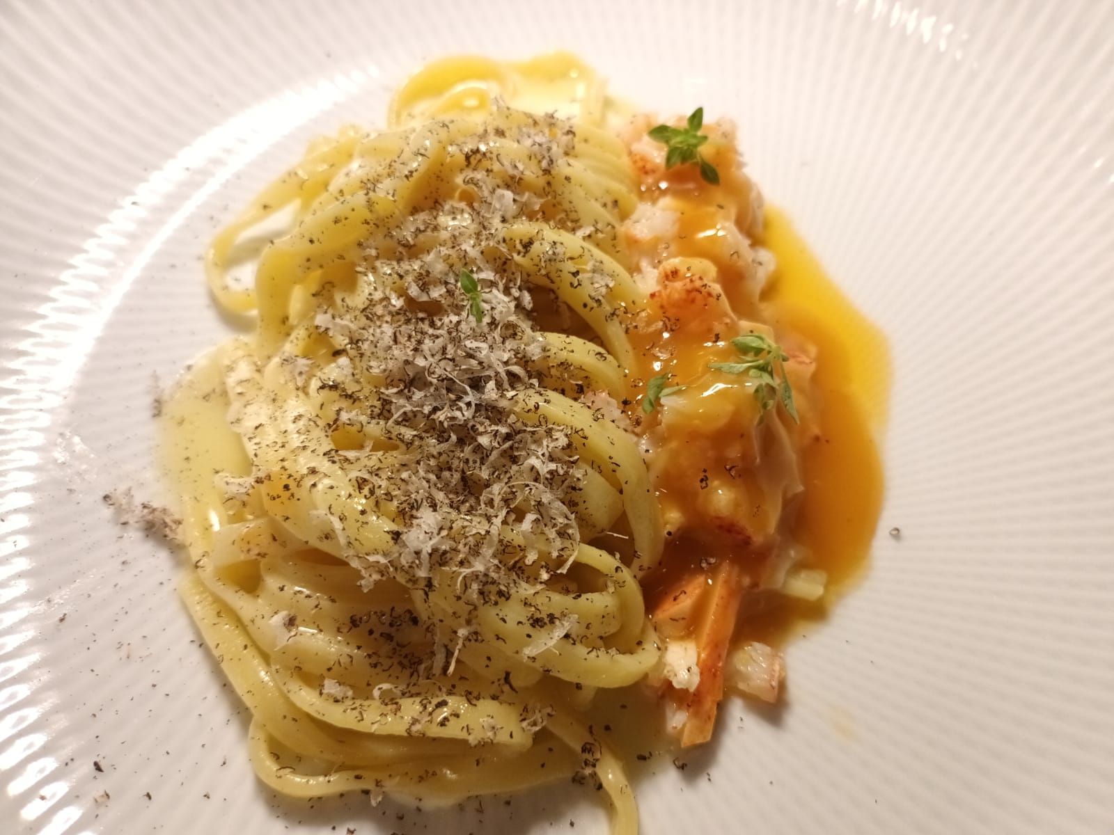 Il primo piatto “signature” per eccellenza è il tagliolino agli agrumi con crescenza di bufala, tartufo nero, tartare di astice ed il suo ristretto.