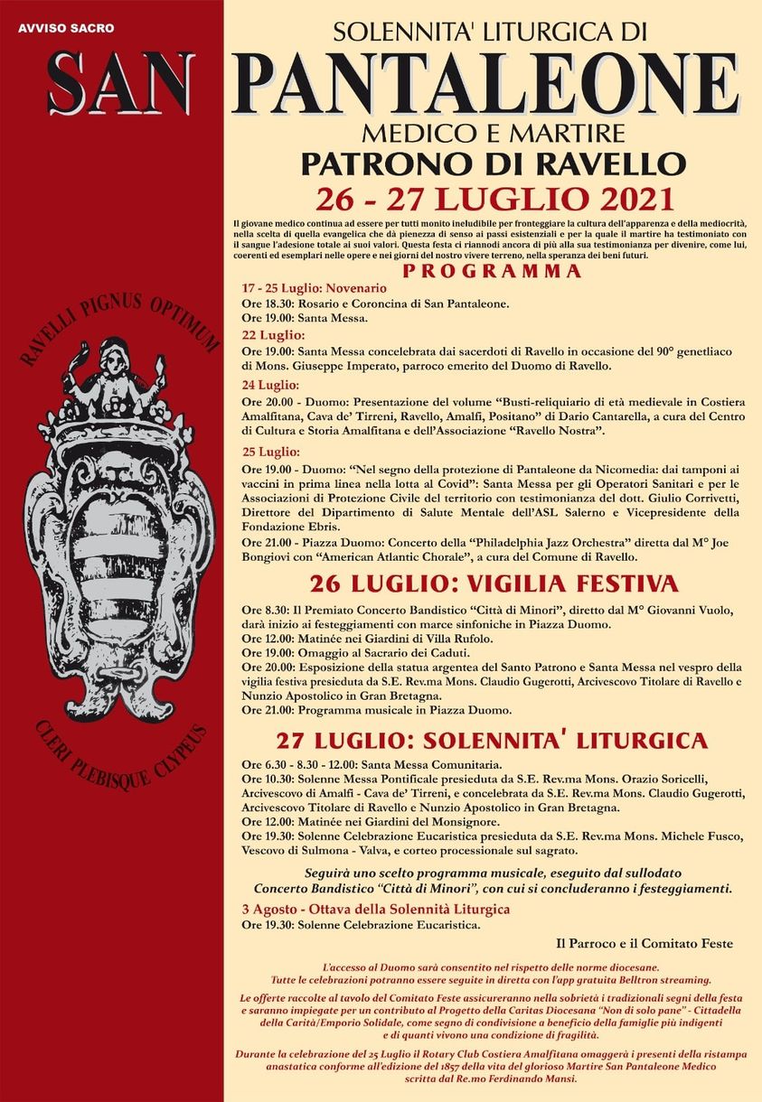 Il 27 luglio, giorno della Solennità liturgica di San Pantelone, le Sante Messe saranno alle 6.30 – 8.30 – 10.30. Alle ore 19.30 Solenne Celebrazione Eucaristica presieduta da S.E. Rev.ma Mons. Orazio Soricelli, Arcivescovo di Amalfi – Cava de’Tirreni.