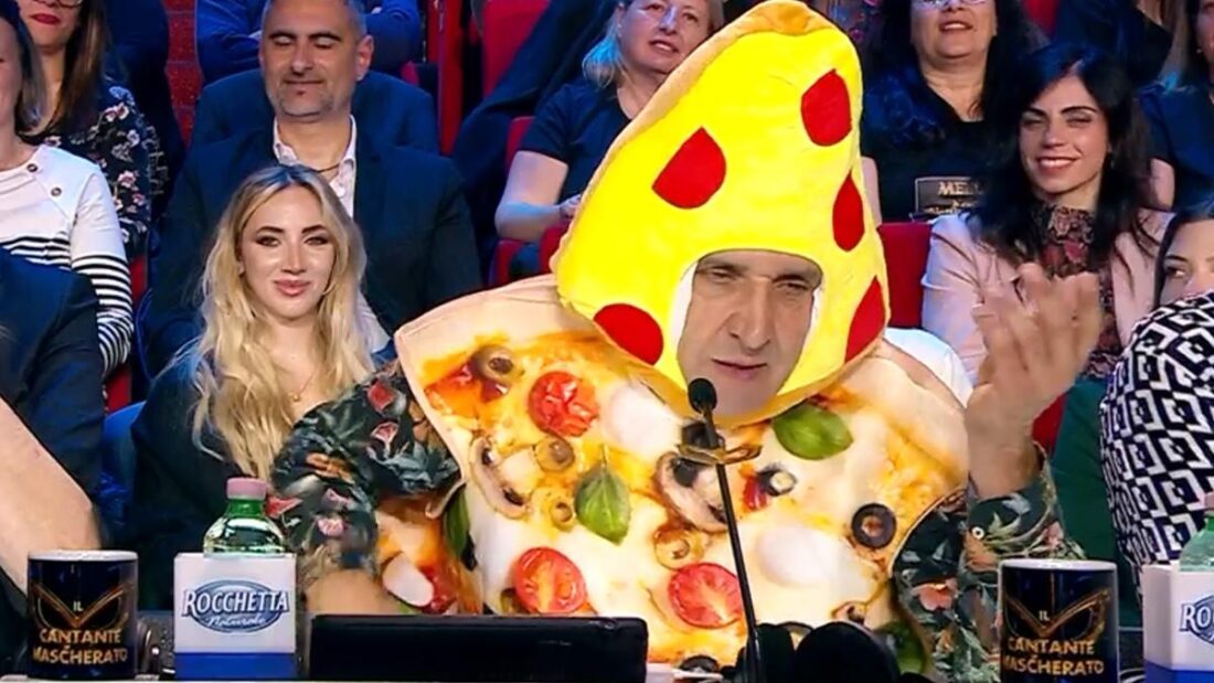 Nella puntata del 15 aprile de Il Cantante Mascherato ha visto Flavio Insinna presentarsi in studio vestito completamente da pizza.