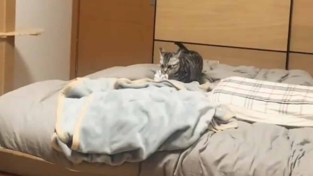 Il gatto si trova accucciato sul letto, ma non perde nemmeno per un attimo di vista la traiettoria della pallina. Quando il suo papà lancia la pallina, vediamo immediatamente il gatto scattare e con un balzo subito va a cercare la palla e poi la prende per riportarla al ragazzo che l’ha lanciata.