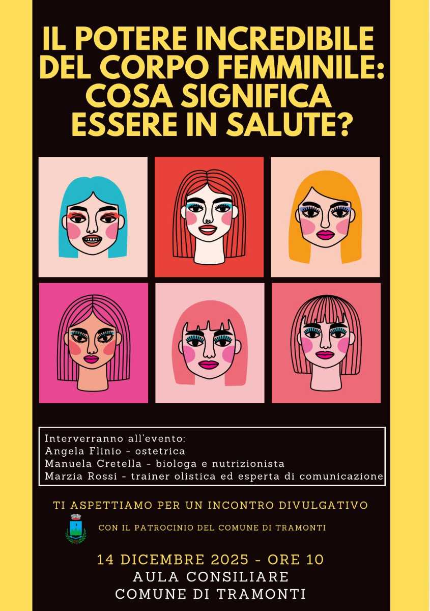 Un appuntamento pensato dalle donne per le donne, un momento di confronto dedicato al benessere femminile in tutte le sue dimensioni. Il 14 dicembre 2025, alle ore 10, l’Aula Consiliare del Comune di Tramonti ospiterà l’incontro divulgativo “Il potere incredibile del corpo femminile: cosa significa essere in salute?”, un evento patrocinato dal Comune e ideato per offrire strumenti concreti, conoscenze aggiornate e una nuova consapevolezza sul rapporto tra corpo, emozioni, alimentazione e stili di vita.