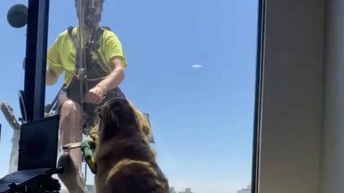 È fondamentale mantenere la concentrazione e cercare di fare il lavoro nel minor tempo possibile. Ma il piccolo pelosetto non rinuncia a cercare di distrarre l’uomo che si presenta regolarmente a fare le pulizie dei vetri del suo palazzo. Infatti vuole fare amicizia con lui.