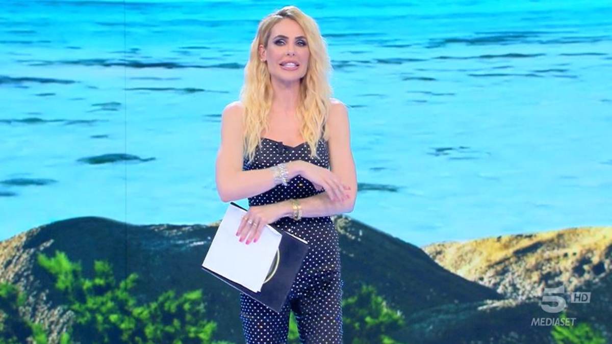 Per la puntata del 13 maggio la conduttrice del reality di Canale 5 ha deciso di indossare un abito pieno di swarowski.