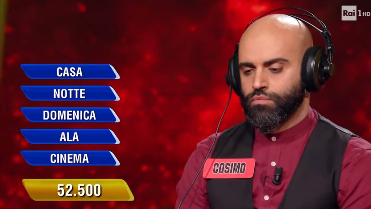 Cosimo è riuscito a superare la penultima sfida conquistando il pass per la Ghigliottina. Il nuovo campione si è seduto di fronte al conduttore, dopo aver accumulato un montepremi di 210.000 euro. Dopo un paio di dimezzamenti il concorrente pugliese ha giocato per 52.500 euro: il valore della parola vincente. Ha dovuto, quindi, trovare il termine che avrebbe potuto collegare gli indizi a sua disposizione, ovvero: Casa, Notte, Domenica, Ala e Cinema.