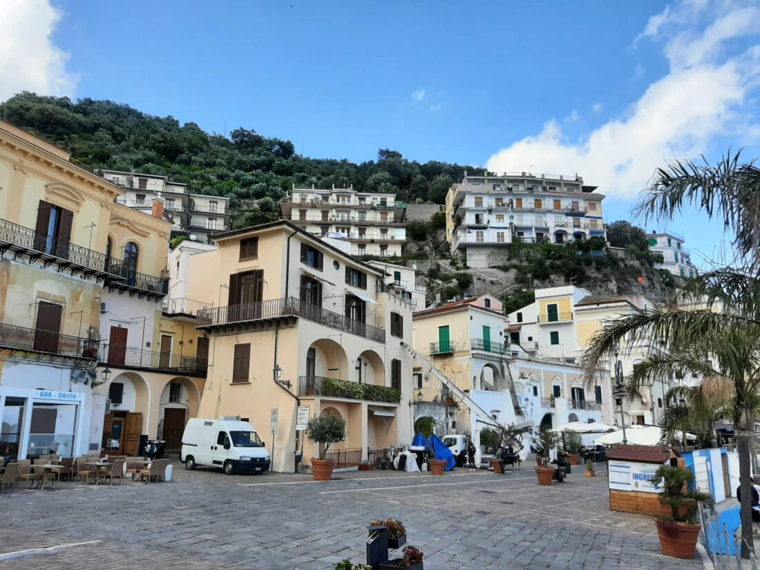 La produzione dopo aver girato nei giorni scorsi alcune scene a Maiori, nell’esclusiva location della Torre Normanna, e sulla strada statale 163 nei pressi di Capo d’Orso si sono recati nel borgo marinaro.
