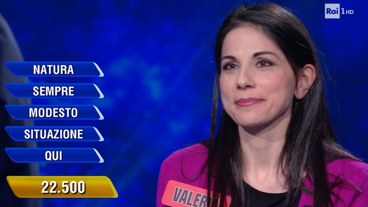 Valeria ad onor del vero è sembrata abbastanza in difficoltà, come ha confessato lei stessa. Alla fine la campionessa ha scelto, davanti alle parole: Natura, Presente, Modesto, Situazione e Qui la parola Verde.