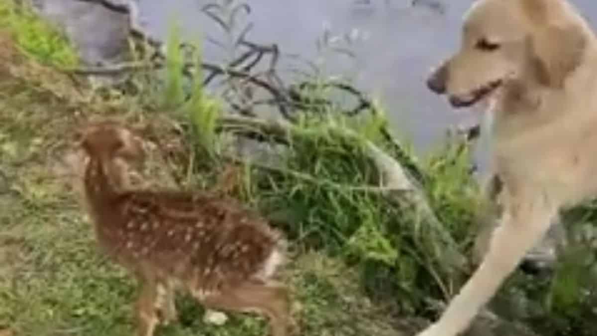 Harley però non tornava e non rispondeva affatto ai comandi del padrone. Infatti, spostandosi di un po’, il suo amico umano ha visto che Harley si era tuffata in un laghetto, perché aveva visto un cerbiatto in pericolo.