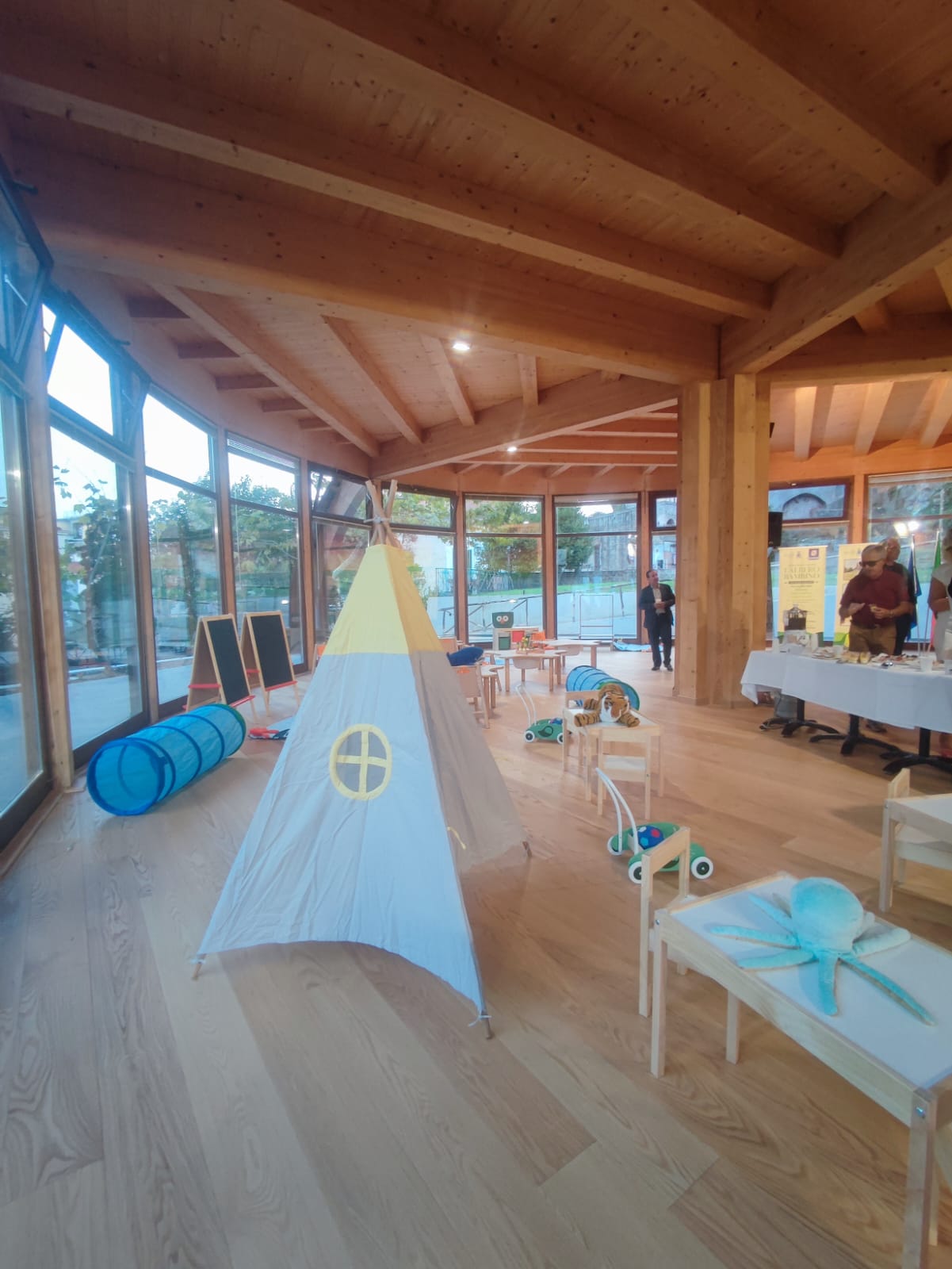 Una struttura pensata, dunque, come un grande atelier, uno spazio dedicato esclusivamente al gioco dei bambini che, grazie alla trasparenza del vetro, è completamente permeabile alla luce e al sole.