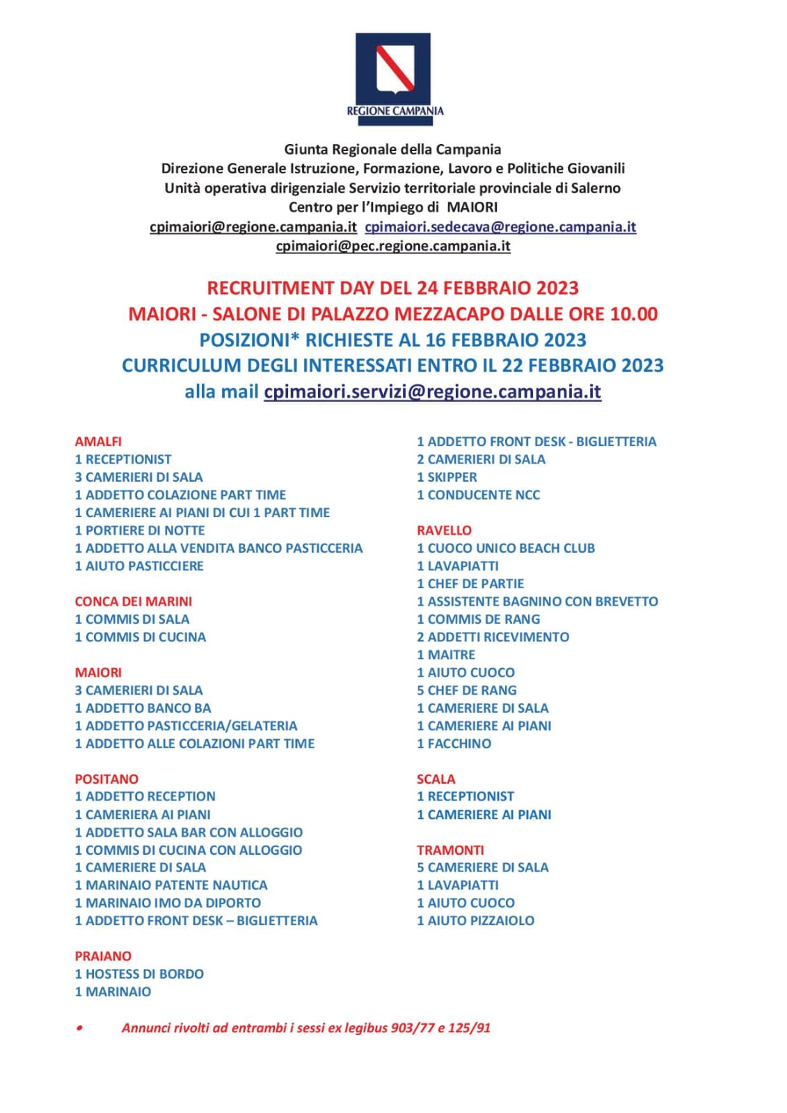 Per rispondere alle esigenze delle strutture ricettive, la Regione Campania organizza una giornata di recruiting, provando a connettere i talenti con il mercato del lavoro. L’appuntamento è per il 24 febbraio a Maiori, nel Salone Mezzacapo del Palazzo Comunale. Qui è in preparazione un incontro tra datori di lavoro in cerca di specifiche posizioni e lavoratori del settore interessati.